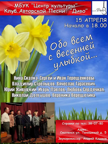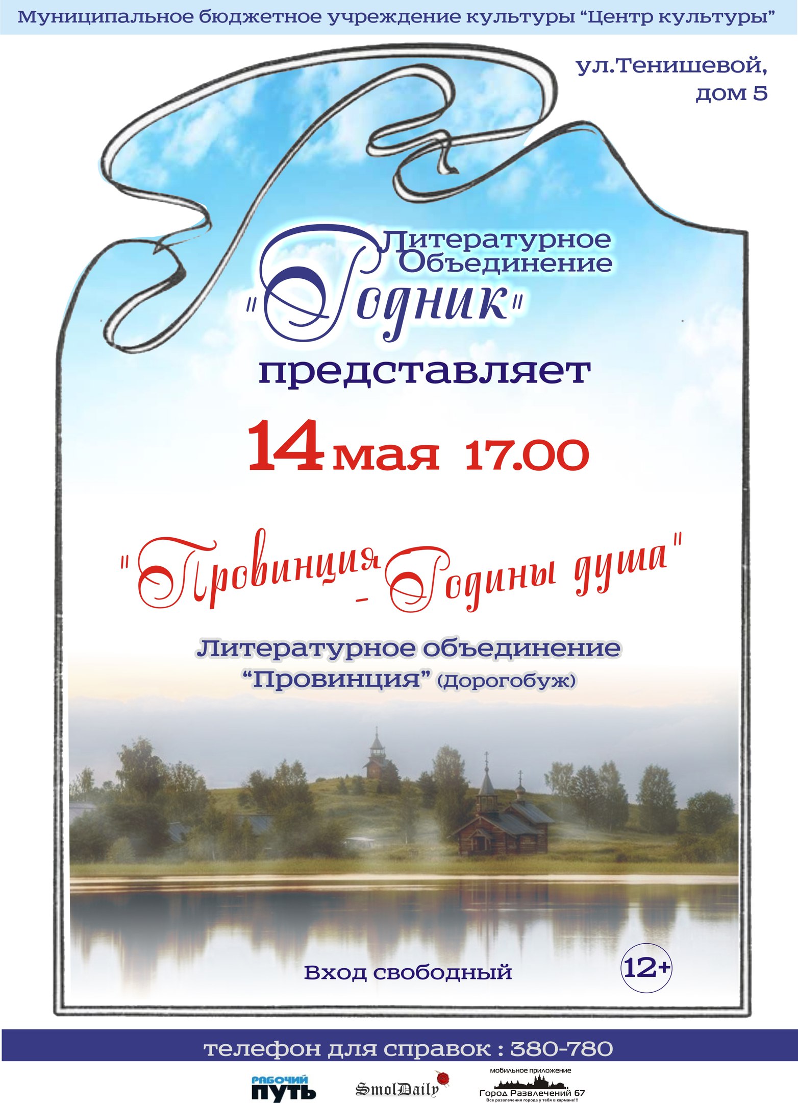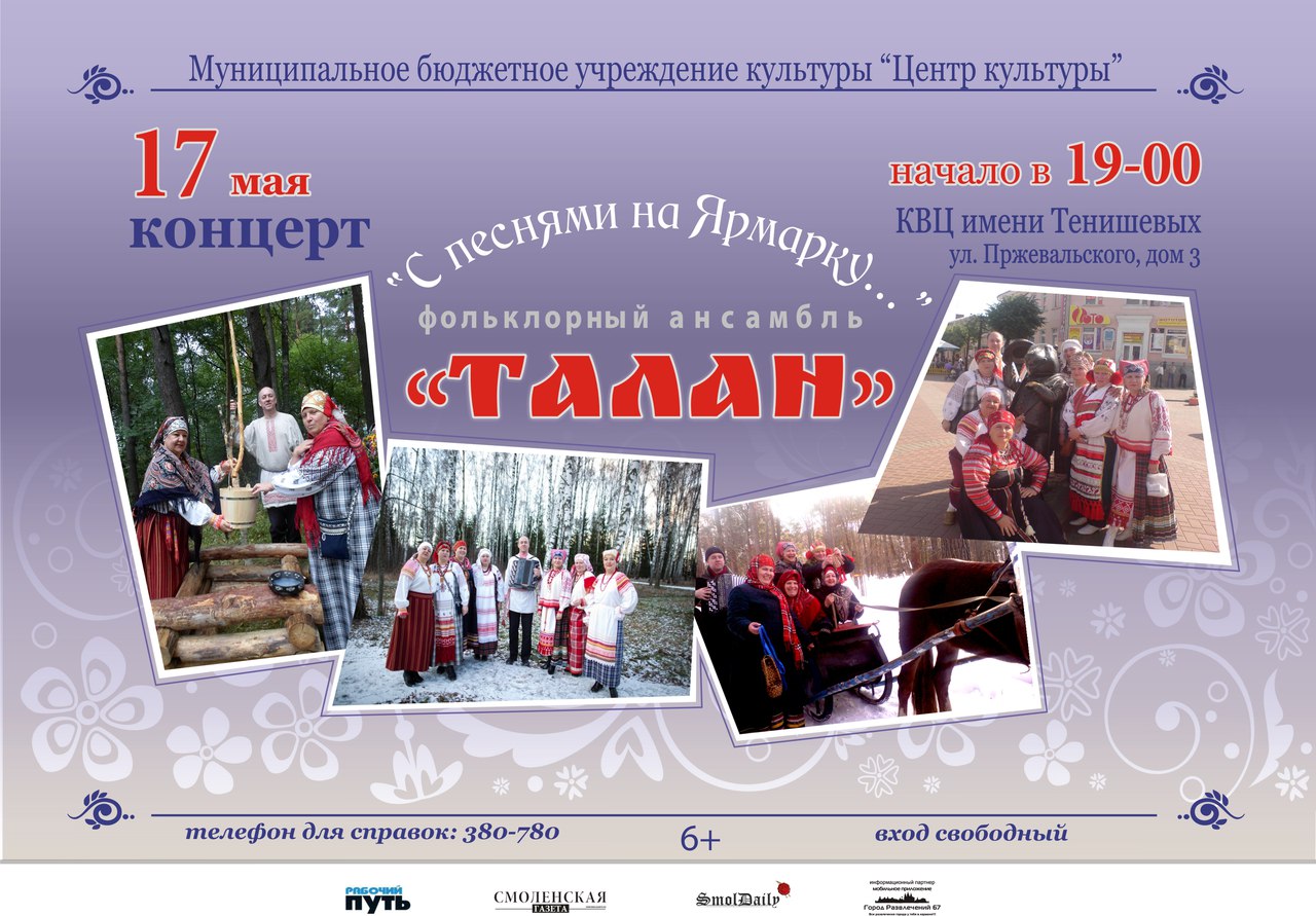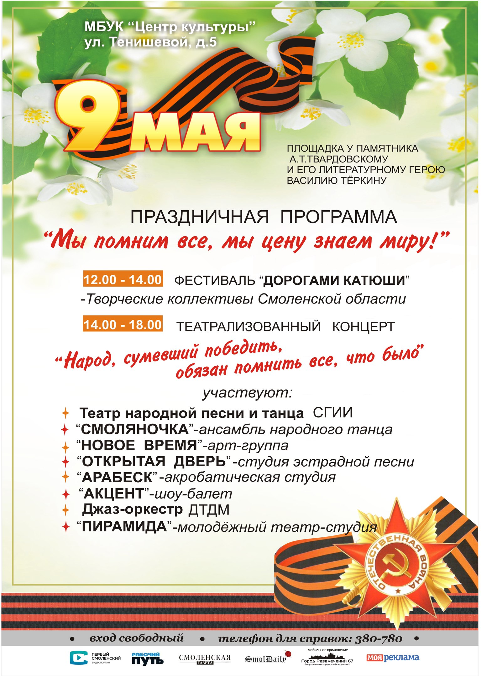 Центр культуры приглашает жителей и гостей города на Праздничную программу 9 мая, посвященную празднованию Дня Победы. На любимой многими творческой площадке у памятника А.Т. Твардовскому и его литературному герою Василию Теркину Вас ожидает : с 12.00 -14.00 военно-патриотический фестиваль «На привале» в рамках всероссийского проекта «Дорогами Катюши»: поэтическая эстрада, выступление творческих коллективов районов области; с 14.00-18.00