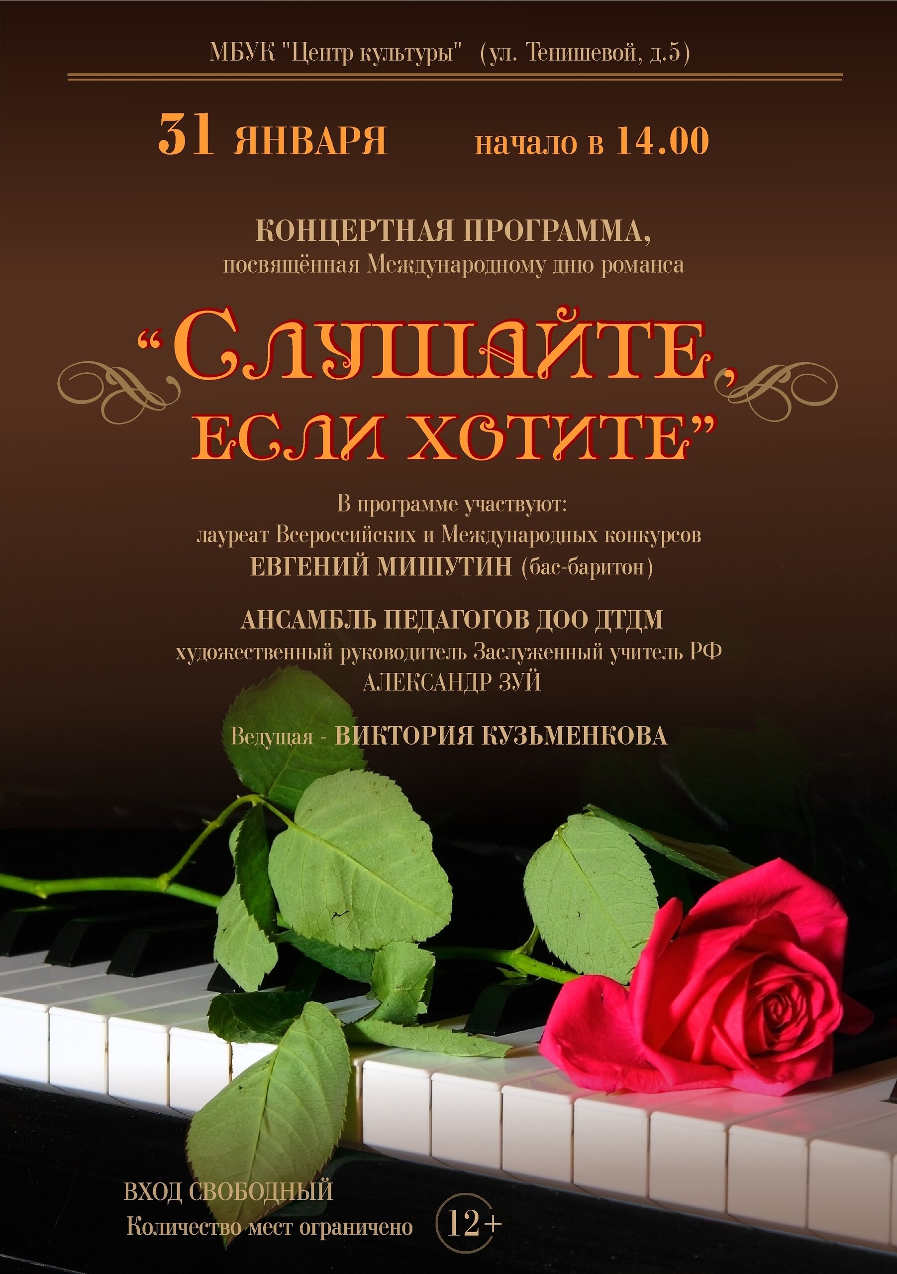 17 октября в помещении МБУК «Центр культуры» состоялся концерт солиста Смоленской областной филармонии Никиты Степанова «Я с музыкой иду через века». В концерте прозвучали арии из опер, оперетт, классические и старинные зарубежные и русские романсы, произведения советской и современной эстрады.